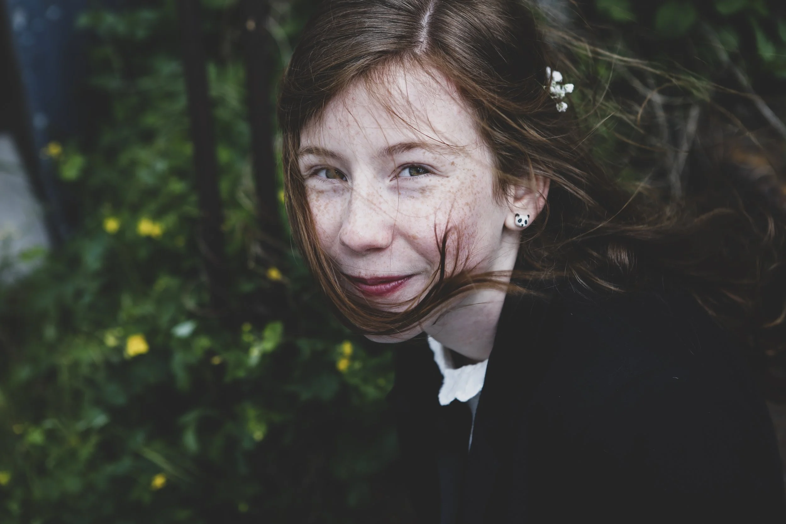 A young girl with red hair and freckles smiling outdoors with green foliage in the background.