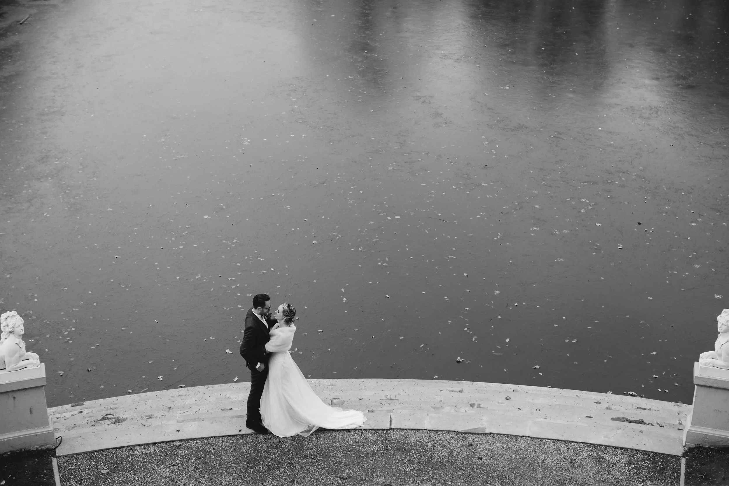 A black and white photo of a bride and groom standing on a stone platform near a body of water. The bride is wearing a white gown and a shawl, and the groom is dressed in a black suit. They are looking at each other. The platform has two decorative s