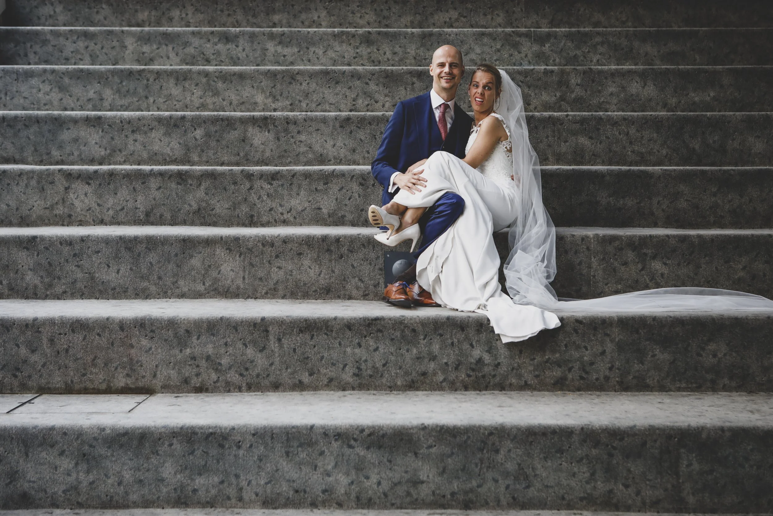 A happy wedding couple sitting on large concrete stairs. The groom is smiling and dressed in a blue suit, white shirt, and red tie, while the bride, in a white wedding dress and veil, looks surprised. They are holding each other, with the bride's lef